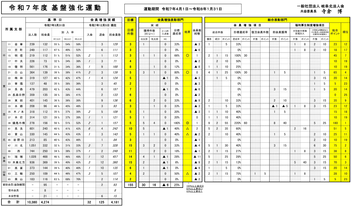 「令和7年度 基盤強化運動(令和7年12月5日現在)」の会員獲得状況です。